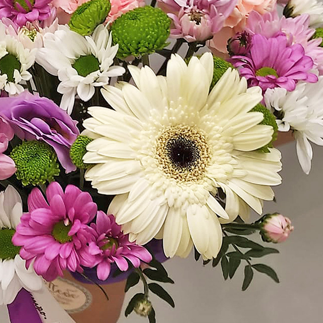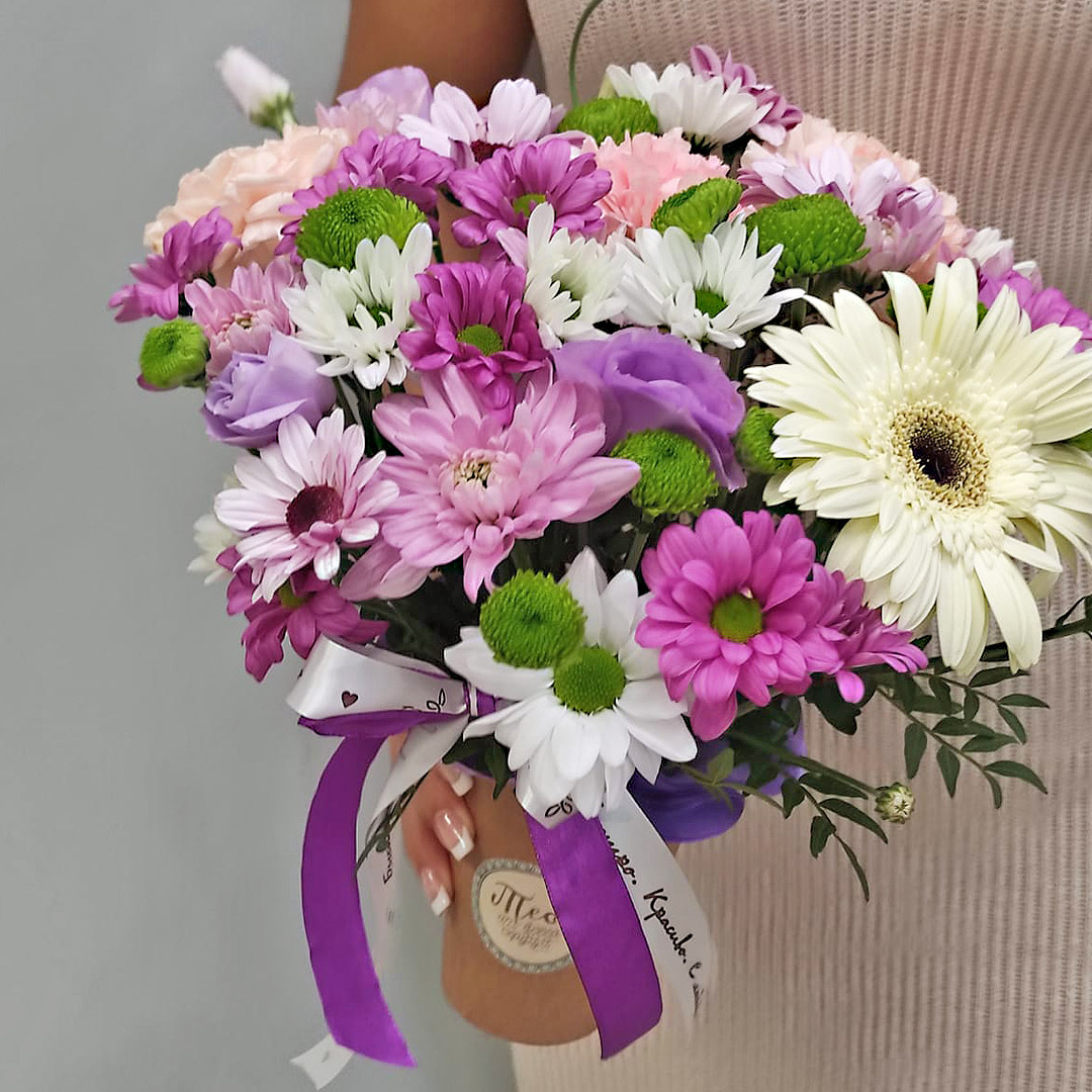 • Сумочка с цветами "Яркая" из кустовой хризантемы, роз и гербер арт. 42134