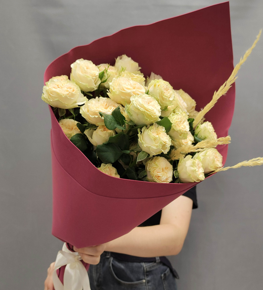 Букет из кремовых кустовых пионовидных розовых роз с эвкалиптом арт. 50416