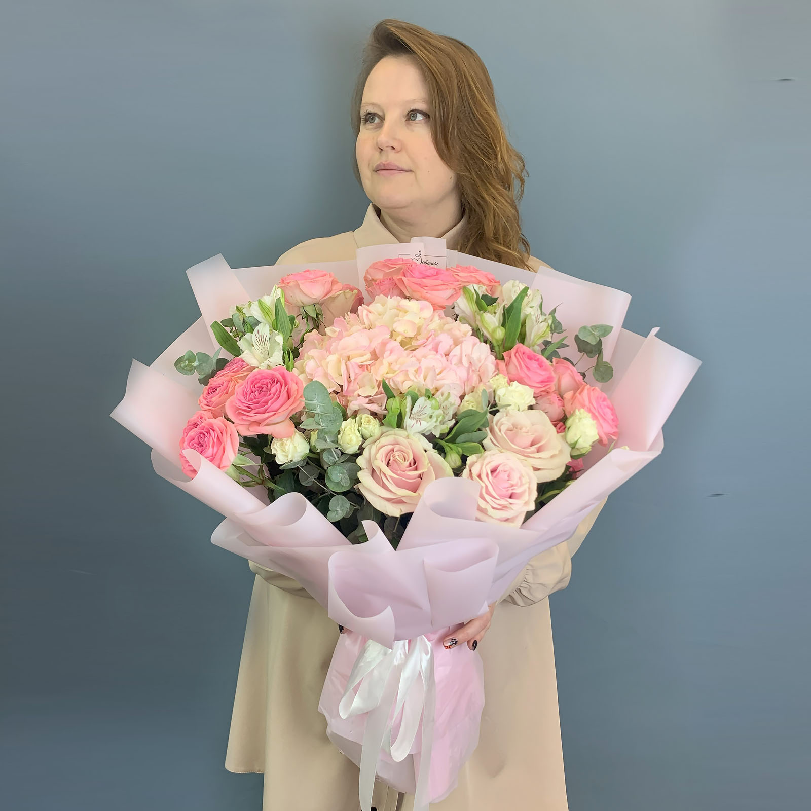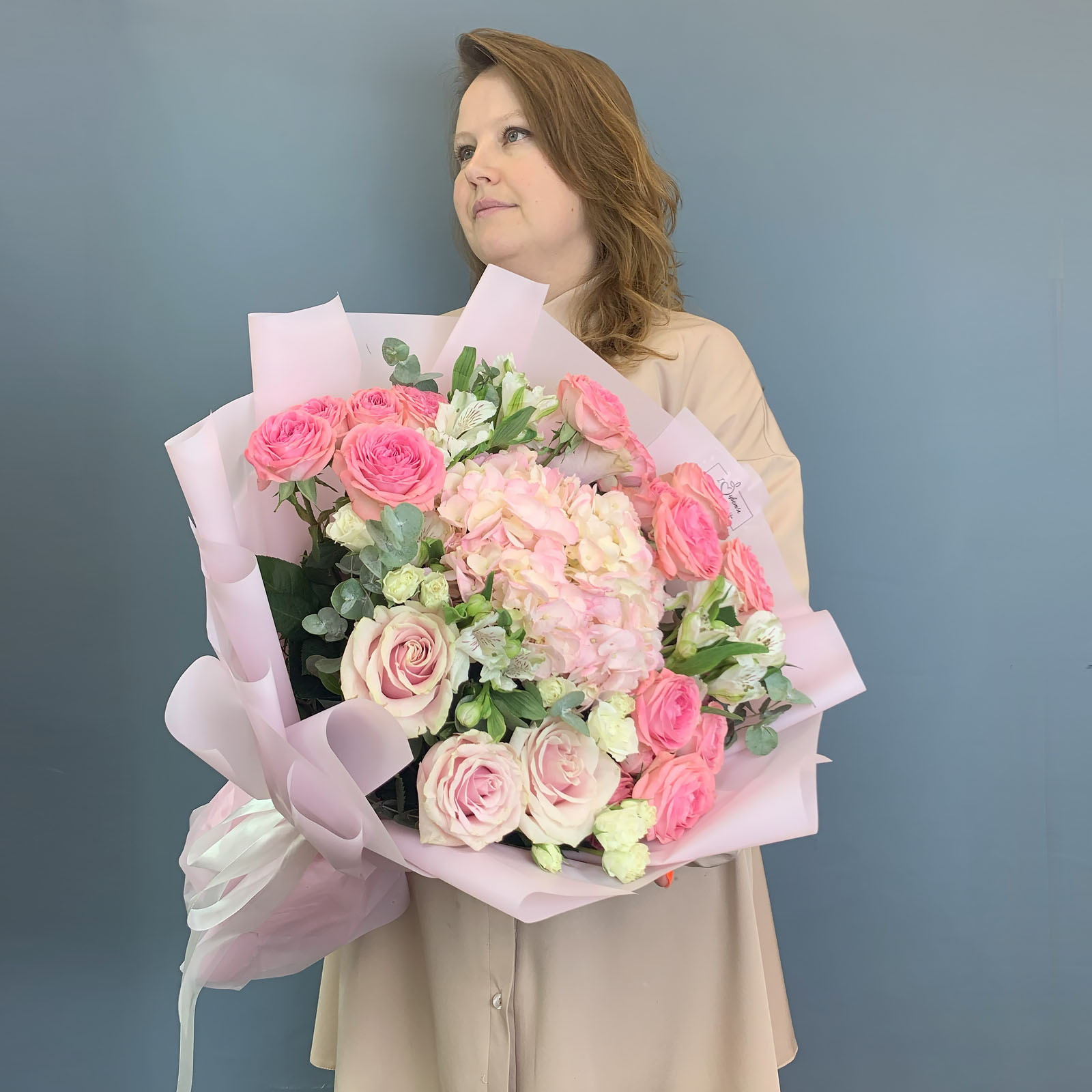 Такой розовый букет хорошо подойдёт девушке, маме, подруге или любимой - он выглядит тёплым, нежным и при этом праздничным. Его можно подарить на день рождения или просто так, когда хочется сказать важные слова без лишнего пафоса, но красиво и искренне.